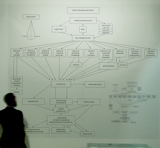 The organigramme took the process of alternative institutionalization to its (il)logical formal extreme, recapitulating and attempting to transcend the institutionalanarchy of the period and the fantastically complex, deliberately opaque web ofstate and parastate organizations within the late Yugoslavian system. In 1990, theBritish authors of the last full edition of the Rough Guide to Yugoslavia observed. “Diagrams of NSK’s organizational structure bear a striking resemblance to thosein Yugoslavian school textbooks which seek to explain the country’s bafflinglycomplex system of political representation.