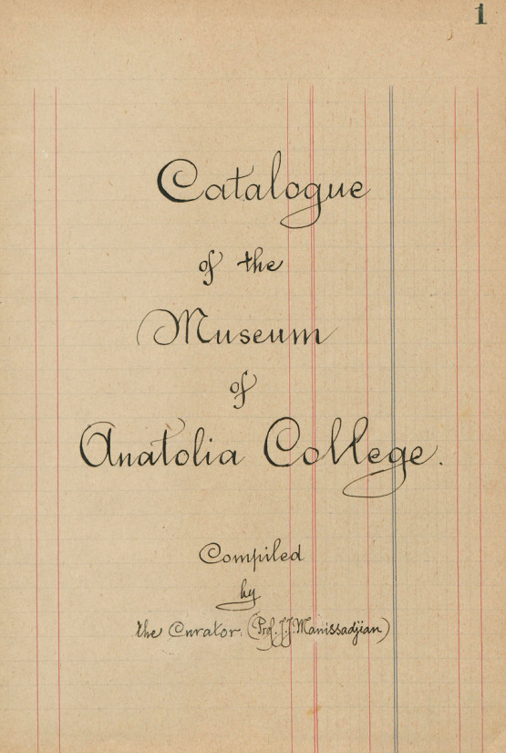 The first page of the Catalogue of The Museum of Anatolia College written by Prof. J. J. Manissadjian, 1917–18, Merzifoun (Merzifon, currently Turkey). Image credit: United Church of Christ (UCC), American Research Institute in Turkey (ARIT), SALT Research.