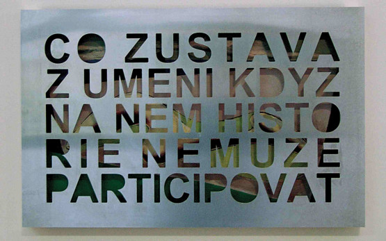 Aluminium plate with cut out text and painting of Frantisek Muzika, Figure in Landscape, 1932.