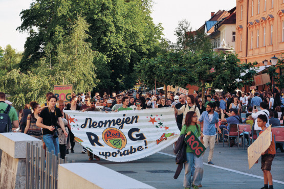 The slogan Neomejen Rog uporabe (Unlimited Date of Expiery) addressed the legal procedures and the question of the ownership of property. Photo: Rio, an active member of Rog community and user of its facilities.