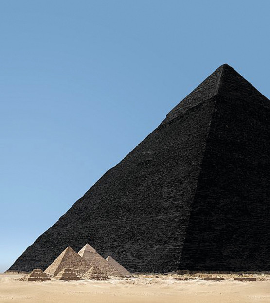 In the background: "A lignite coal pyramid with a base side of 1,422 meters and a height of 905 meters created by the electrical power consumption of the Internet in 2009, totaling 1,000,000,000,000 kWh’s. The lignite briquettes would create a line 1.5 times as big as the distance between Earth and Sun."